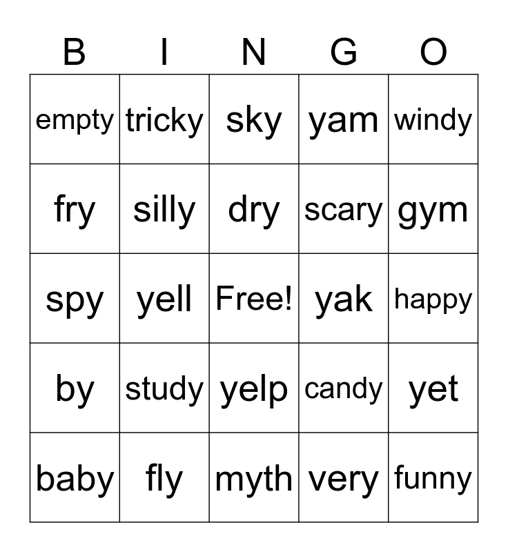 This bingo card has a free space and 29 words: baby, city, yell, yellow, empty, sky, silly, study, yak, fly, happy, funny, myth, very, gym, my, yelp, by, windy, spy, candy, yes, scary, fry, yam, tricky, yet, dry and shy.