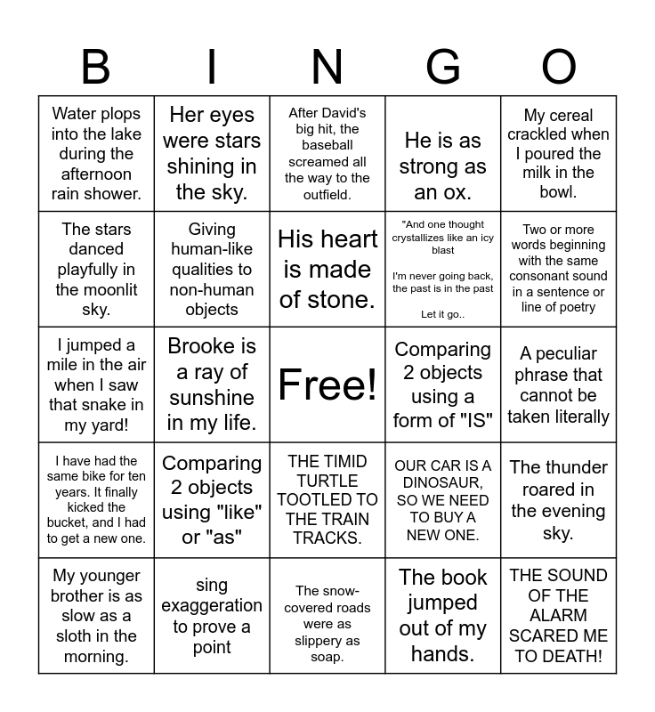 This bingo card has a free space and 29 words: My younger brother is as slow as a sloth in the morning., I’m so nervous that I think I’m going to have a heart attack!, Brooke is a ray of sunshine in my life., Robby raced down the road in red roller blades., Water plops into the lake during the afternoon rain shower., After David's big hit, the baseball screamed all the way to the outfield., Giving human-like qualities to non-human objects, Comparing 2 objects using "like" or "as", Comparing 2 objects using a form of "IS", sing exaggeration to prove a point, A peculiar phrase that cannot be taken literally, THE SOUND OF THE ALARM SCARED ME TO DEATH!, The snow-covered roads were as slippery as soap., The book jumped out of my hands., Two or more words beginning with the same consonant sound in a sentence or line of poetry, My new bike is a jet plane because it goes so fast!, THE TIMID TURTLE TOOTLED TO THE TRAIN TRACKS., I have had the same bike for ten years. It finally kicked the bucket, and I had to get a new one., My cereal crackled when I poured the milk in the bowl., I jumped a mile in the air when I saw that snake in my yard!, OUR CAR IS A DINOSAUR, SO WE NEED TO BUY A NEW ONE., The snow is a white blanket.., "And one thought crystallizes like an icy blast I'm never going back, the past is in the past Let it go.., The stars danced playfully in the moonlit sky., He is as strong as an ox., Her eyes were stars shining in the sky., The thunder roared in the evening sky., His heart is made of stone. and "I've got gadgets and gizmos aplenty".