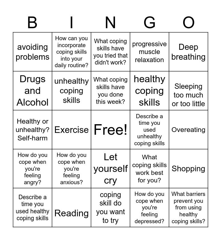 This bingo card has a free space and 24 words: How do you cope when you're feeling anxious?, Reading, What coping skills have you done this week?, Describe a time you used healthy coping skills, Deep breathing, avoiding problems, Drugs and Alcohol, How can you incorporate coping skills into your daily routine?, Describe a time you used unhealthy coping skills, Let yourself cry, healthy coping skills, Healthy or unhealthy? Self-harm, What coping skills work best for you?, Shopping, unhealthy coping skills, How do you cope when you're feeling depressed?, Overeating, What coping skills have you tried that didn't work?, Sleeping too much or too little, Exercise, What barriers prevent you from using healthy coping skills?, How do you cope when you're feeling angry?, progressive muscle relaxation and coping skill do you want to try.