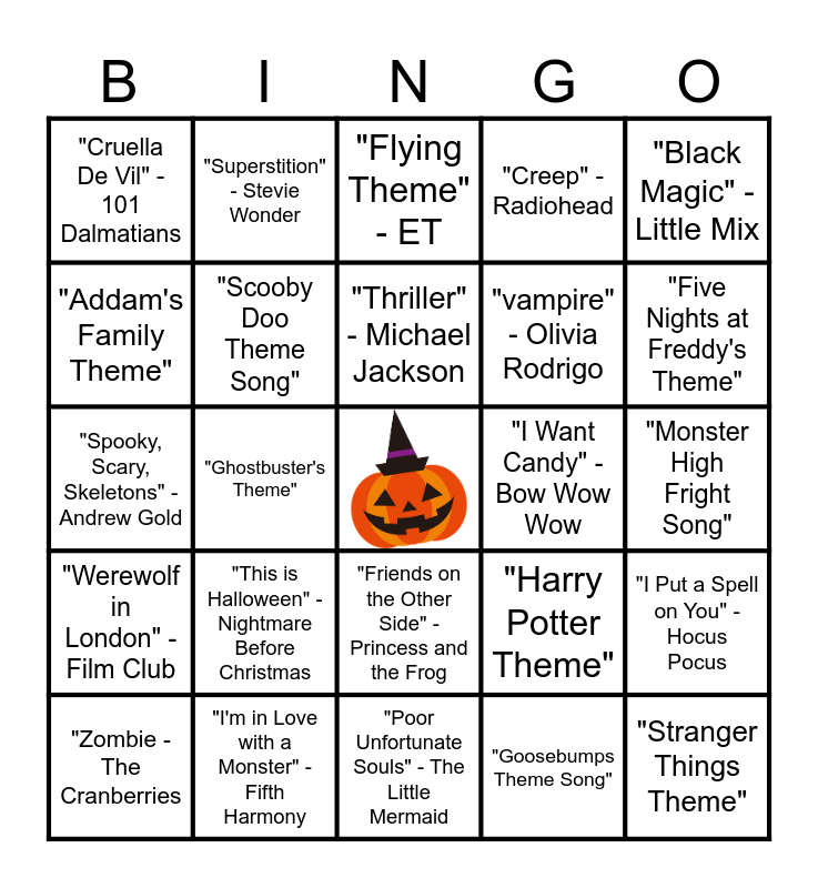 This bingo card has a free space and 24 words: "This is Halloween" - Nightmare Before Christmas, "I'm in Love with a Monster" - Fifth Harmony, "Thriller" - Michael Jackson, "Zombie - The Cranberries, "Black Magic" - Little Mix, "Cruella De Vil" - 101 Dalmatians, "Addam's Family Theme", "Superstition" - Stevie Wonder, "I Want Candy" - Bow Wow Wow, "Friends on the Other Side" - Princess and the Frog, "vampire" - Olivia Rodrigo, "Spooky, Scary, Skeletons" - Andrew Gold, "Harry Potter Theme", "I Put a Spell on You" - Hocus Pocus, "Scooby Doo Theme Song", "Goosebumps Theme Song", "Monster High Fright Song", "Flying Theme" - ET, "Five Nights at Freddy's Theme", "Ghostbuster's Theme", "Stranger Things Theme", "Werewolf in London" - Film Club, "Creep" -Radiohead and "Poor Unfortunate Souls" - The Little Mermaid.