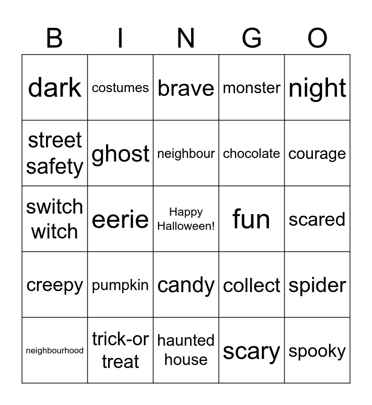 This bingo card has a free space and 24 words: pumpkin, trick-or treat, neighbour, neighbourhood, night, dark, street safety, costumes, fun, candy, chocolate, switch witch, collect, spider, ghost, scary, scared, brave, courage, eerie, spooky, creepy, monster and haunted house.