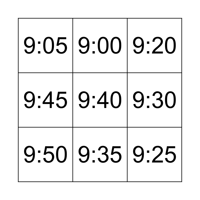 This bingo card has 12 words: 9:10, 9:25, 9:40, 9:30, 9:00, 9:20, 9:35, 9:15, 9:05, 9:45, 9:50 and 9:55.