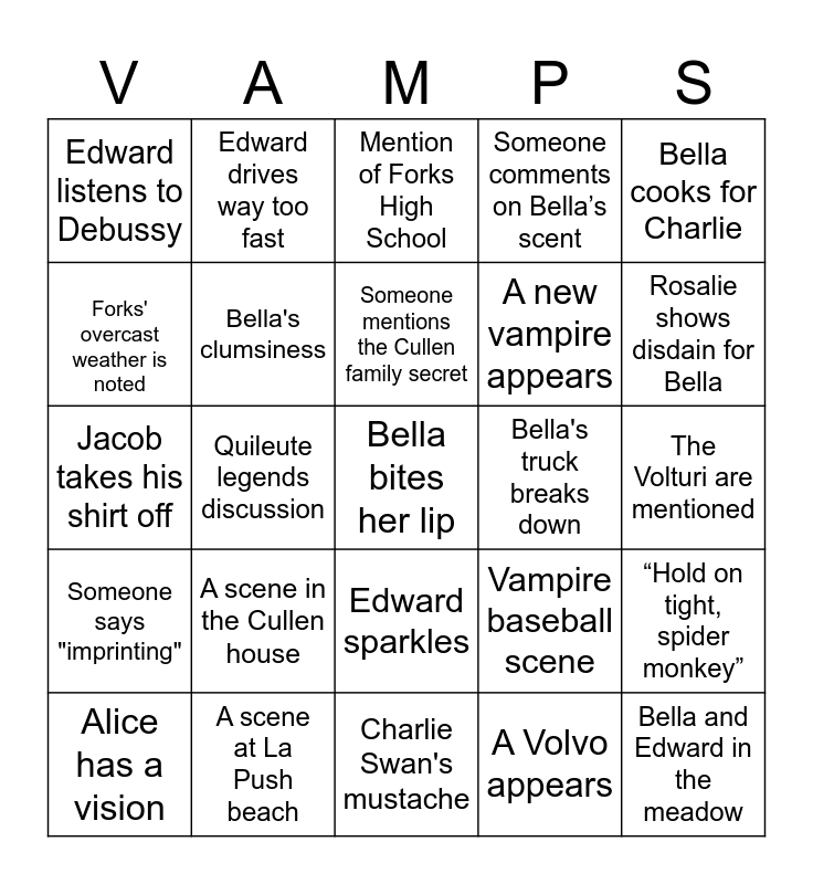 This bingo card has a free space and 29 words: Alice has a vision, Mention of the treaty line, Quileute legends discussion, Edward stands protectively by Bella, Edward listens to Debussy, Mention of Forks High School, Bella's clumsiness, A scene in the Cullen house, Bella's truck breaks down, A scene at La Push beach, The Volturi are mentioned, Bella and Edward in the meadow, Charlie Swan's mustache, A Volvo appears, Rosalie shows disdain for Bella, The Cullens' golden eyes, Edward sparkles, Someone says "imprinting", Bella cooks for Charlie, Jacob takes his shirt off, Vampire baseball scene, The phrase "vegetarian vampire", A new vampire appears, Forks' overcast weather is noted, Someone comments on Bella’s scent, Edward drives way too fast, “Hold on tight, spider monkey”, Someone mentions the Cullen family secret and Mention of the cold skin.