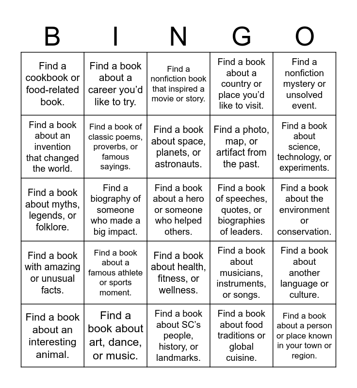 This bingo card has 25 words: Find a book about a famous athlete or sports moment., Find a book about SC’s people, history, or landmarks., Find a book about space, planets, or astronauts., Find a book about an interesting animal., Find a nonfiction mystery or unsolved event., Find a cookbook or food-related book., Find a book about an invention that changed the world., Find a book about a career you’d like to try., Find a book of speeches, quotes, or biographies of leaders., Find a book about health, fitness, or wellness., Find a photo, map, or artifact from the past., Find a book about myths, legends, or folklore., Find a book about musicians, instruments, or songs., Find a book about another language or culture., Find a book of classic poems, proverbs, or famous sayings., Find a book about a person or place known in your town or region., Find a book about the environment or conservation., Find a nonfiction book that inspired a movie or story., Find a book about science, technology, or experiments., Find a biography of someone who made a big impact., Find a book about a hero or someone who helped others., Find a book about art, dance, or music., Find a book with amazing or unusual facts., Find a book about a country or place you’d like to visit. and Find a book about food traditions or global cuisine..
