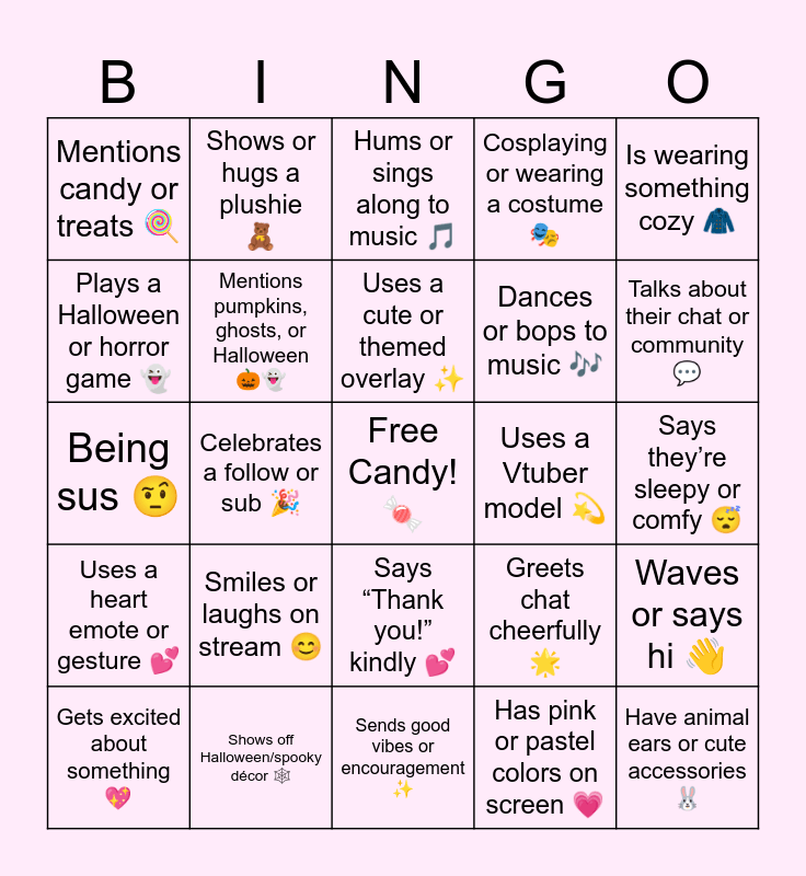 This bingo card has a free space and 24 words: Smiles or laughs on stream π, Shows off Halloween/spooky dΓ©cor πΈοΈ, Uses a cute or themed overlay β¨, Gets excited about something π, Is wearing something cozy π§₯, Mentions candy or treats π, Plays a Halloween or horror game π», Shows or hugs a plushie π§Έ, Uses a Vtuber model π«, Says βThank you!β kindly π, Dances or bops to music πΆ, Being sus π€¨, Greets chat cheerfully π, Waves or says hi π, Mentions pumpkins, ghosts, or Halloween ππ», Has pink or pastel colors on screen π, Says theyβre sleepy or comfy π΄, Hums or sings along to music π΅, Talks about their chat or community π¬, Celebrates a follow or sub π, Have animal ears or cute accessories π°, Uses a heart emote or gesture π, Cosplaying or wearing a costume π and Sends good vibes or encouragement β¨.