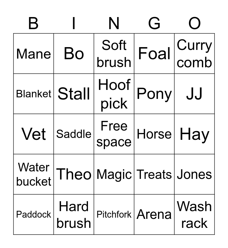 This bingo card has a free space and 39 words: Cowboy boots, Fly spray, Barn, Stall, Paddock, Magic, Hoof pick, Cinna, Curry comb, Water bucket, Saddle, Foal, Wash rack, Hay, Horse, Theo, Horseshoe, Mane, Lead rope, Treats, Blanket, Pitchfork, Pony, JJ, Horse feed, Paint, Shovel, Gryffin, Thoroughbred, Bo, Mane, Stella, Soft brush, Hard brush, Arena, Hoof, Jones, Vet and Farrier.