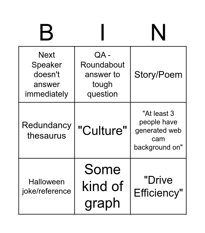 This bingo card has a free space and 8 words: "At least 3 people have generated web cam background on", Story/Poem, QA - Roundabout answer to tough question, Halloween joke/reference, Next Speaker doesn't answer immediately, "Drive Efficiency", Redundancy thesaurus and Some kind of graph.