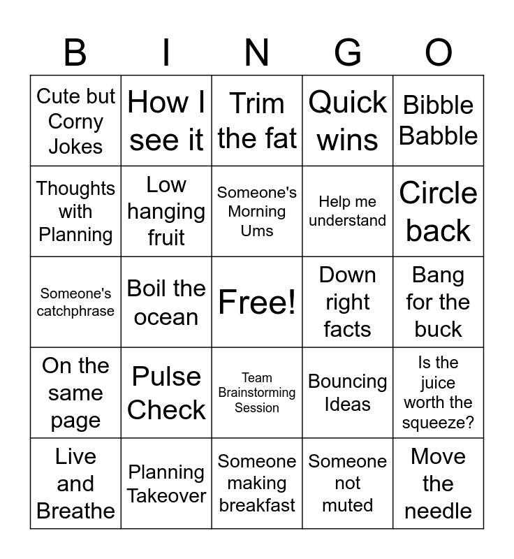 This bingo card has a free space and 24 words: Pulse Check, Planning Takeover, Someone's Morning Ums, Live and Breathe, Bibble Babble, Cute but Corny Jokes, Thoughts with Planning, How I see it, Down right facts, Team Brainstorming Session, Help me understand, Someone's catchphrase, Bouncing Ideas, Is the juice worth the squeeze?, Low hanging fruit, Someone not muted, Bang for the buck, Trim the fat, Circle back, Boil the ocean, Move the needle, On the same page, Quick wins and Someone making breakfast.