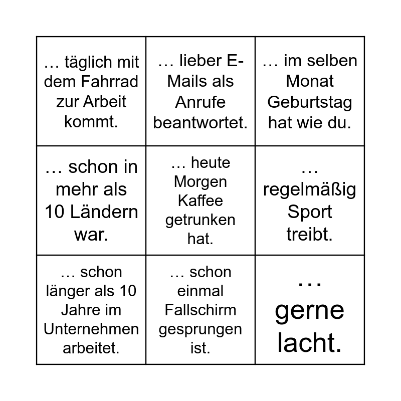 This bingo card has a free space and 8 words: … regelmäßig Sport treibt., … im selben Monat Geburtstag hat wie du., … lieber E- Mails als Anrufe beantwortet., … schon länger als 10 Jahre im Unternehmen arbeitet., … täglich mit dem Fahrrad zur Arbeit kommt., … gerne lacht., … schon in mehr als 10 Ländern war. and … schon einmal Fallschirm gesprungen ist..