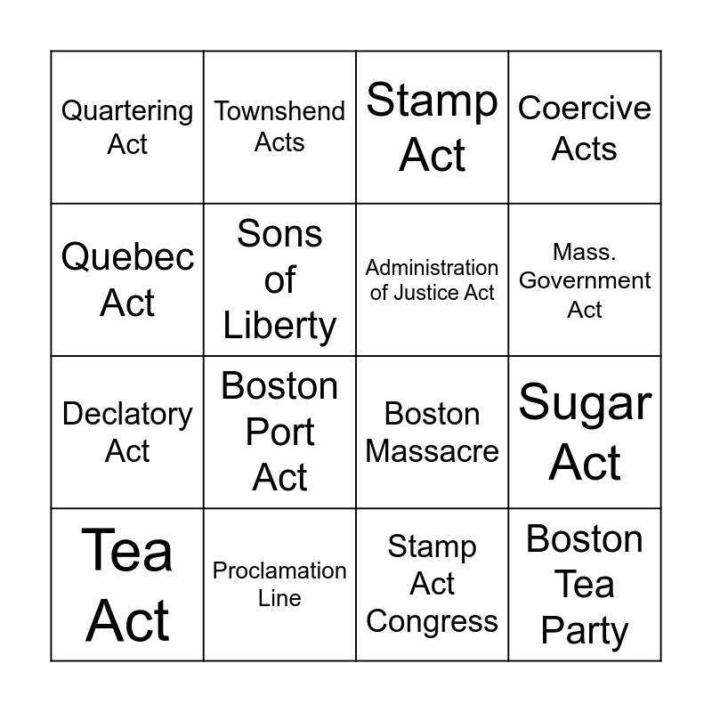 This bingo card has 16 words: Proclamation Line, Sugar Act, Stamp Act, Quartering Act, Declatory Act, Townshend Acts, Boston Massacre, Stamp Act Congress, Quebec Act, Sons of Liberty, Tea Act, Coercive Acts, Boston Port Act, Mass. Government Act, Administration of Justice Act and Boston Tea Party.