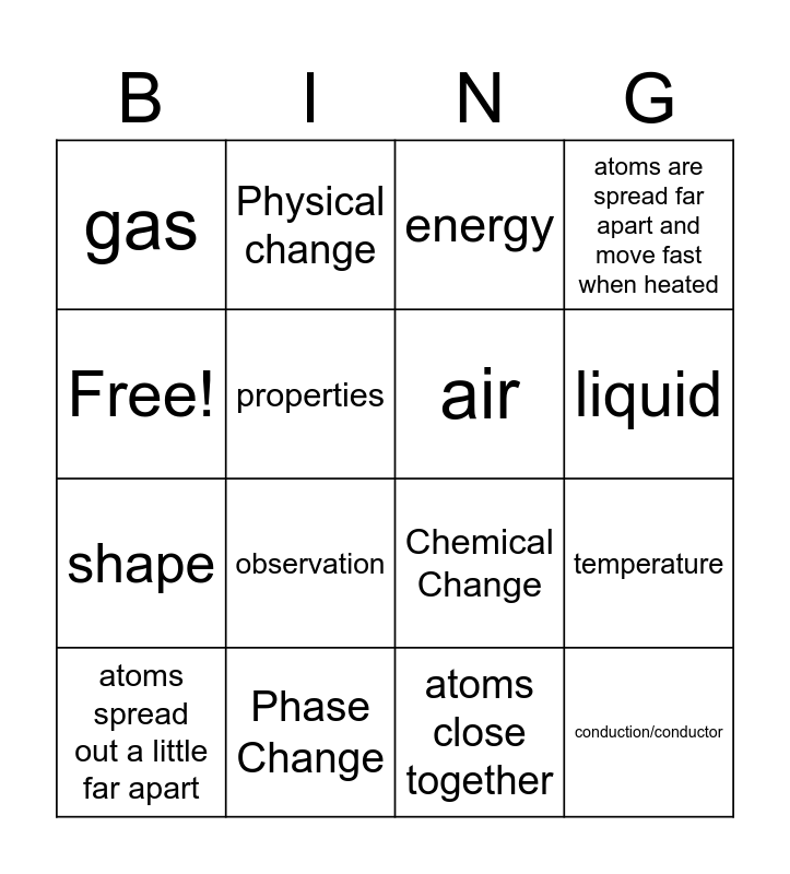 This bingo card has 16 words: Phase Change, temperature, energy, gas, shape, Physical change, Chemical Change, atoms close together, Free!, properties, atoms spread out a little far apart, atoms are spread far apart and move fast when heated, observation, liquid, air and conduction/conductor.