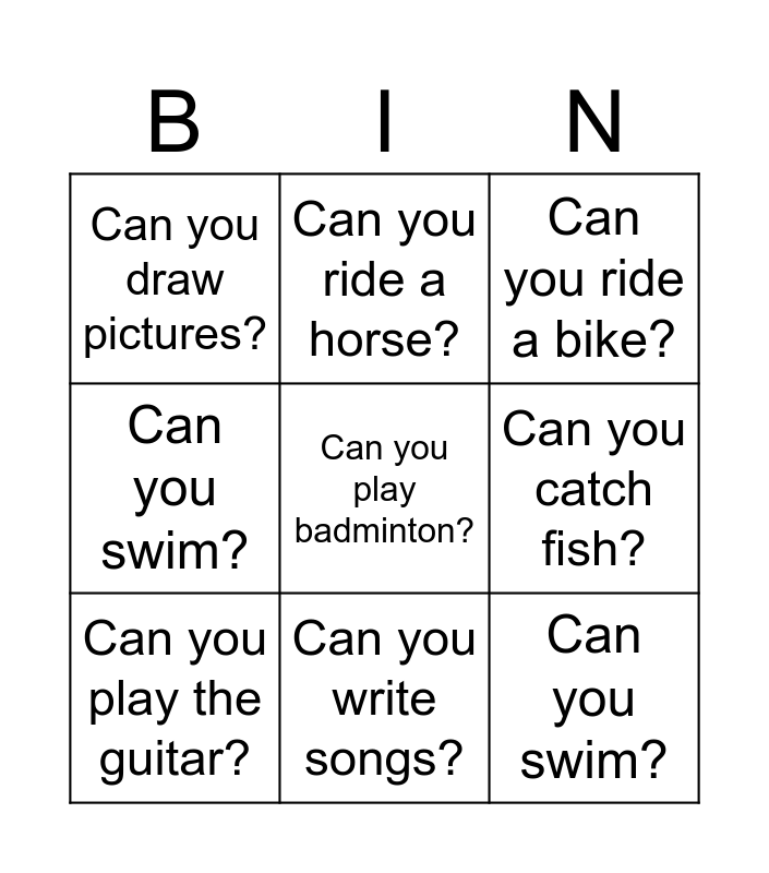 This bingo card has 9 words: Can you play the guitar?, Can you ride a bike?, Can you ride a horse?, Can you swim?, Can you draw pictures?, Can you catch fish?, Can you play badminton?, Can you swim? and Can you write songs?.