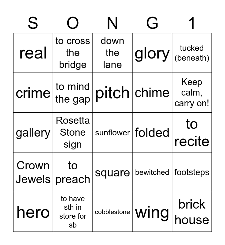 This bingo card has 27 words: bewitched, brick house, chime, cobblestone, crime, down the lane, to cross the bridge, Crown Jewels, folded, footsteps, gallery, glory, hero, to have sth in store for sb, Keep calm, carry on!, market, to mind the gap, pitch, to preach, real, to recite, wing, Rosetta Stone sign, sunflower, square, tucked (beneath) and water lily.