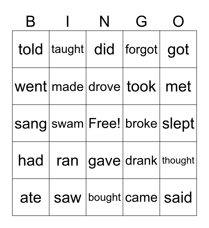 This bingo card has a free space and 29 words: ate, wrote, swam, found, told, did, made, ran, broke, saw, slept, said, bought, came, met, read, gave, had, got, sang, drank, flew, took, went, forgot, taught, thought, drove and wore.