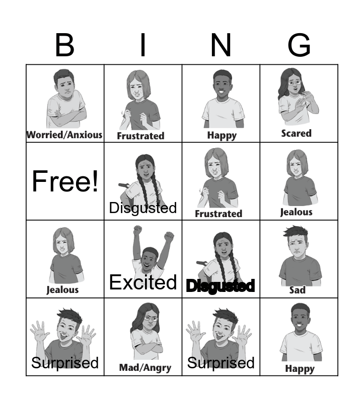 This bingo card has 15 images and 6 words: Disgusted, Surprised, Free!, Disgusted, Surprised and Excited.