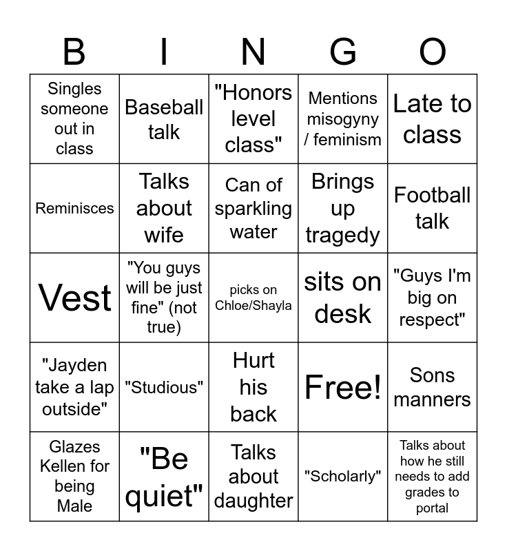 This bingo card has 25 words: "Studious", Talks about daughter, Can of sparkling water, Glazes Kellen for being Male, Late to class, Singles someone out in class, Reminisces, Baseball talk, sits on desk, Hurt his back, Brings up tragedy, Vest, Free!, Sons manners, Talks about wife, Talks about how he still needs to add grades to portal, "Guys I'm big on respect", "Honors level class", Football talk, "You guys will be just fine" (not true), picks on Chloe/Shayla, "Be quiet", "Jayden take a lap outside", Mentions misogyny / feminism and "Scholarly".
