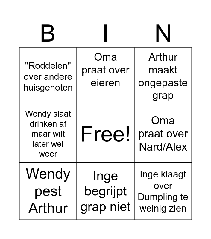 This bingo card has a free space and 12 words: Arthur/Inge praat over bus, Oma vraagt naar rijbewijs, Inge klaagt over Dumpling te weinig zien, Oma praat over Nard/Alex, Oma praat over eieren, Arthur maakt ongepaste grap, Inge begrijpt grap niet, Gespreksonderwerp: teckels, ''Roddelen'' over andere huisgenoten, Wendy slaat drinken af maar wilt later wel weer, Wendy pest Arthur and Arthur pest Wendy.