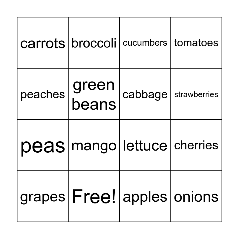 This bingo card has 22 words: Free!, VEGETABLES, broccoli, beans, green beans, cabbage, carrots, cucumbers, lettuce, onions, peas, tomatoes, FRUIT, oranges, apples, bananas, cherries, grapes, mango, peaches, strawberries and pears.