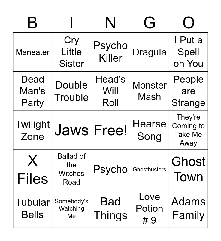 This bingo card has a free space and 50 words: Abracadabra, Adams Family, Bad Moon Rising, Bad Things, Ballad of the Witches Road, Buffy the Vampire Slayer, Cry Little Sister, Day-O, Dead Man's Party, Don't Fear the Reaper, Double Trouble, Dragula, Ghost Town, Ghostbusters, Goo Goo Muck, Halloween, Head's Will Roll, Hearse Song, House of the Rising Sum, I Put a Spell on You, Jaws, Love Potion # 9, Maneater, Monster Mash, Night on Bald Mountain, Paint it Black, People are Strange, Phantom of the Opera, Psycho Killer, Psycho, Purple People Eater, Red Right Hand, Running Up That Hill, Season of the Witch, Somebody's Watching Me, Spooky Scary Skeletons, Superstition, The Killing Moon, Munsters, They're Coming to Take Me Away, This is Halloween, Tiptoe Through the Tulips, Toccatta and Fugue in D Minor, Tonight You Belong to Me, Tubular Bells, Twilight Zone, Weird Science, Werewolves of London, X Files and You're Dead.