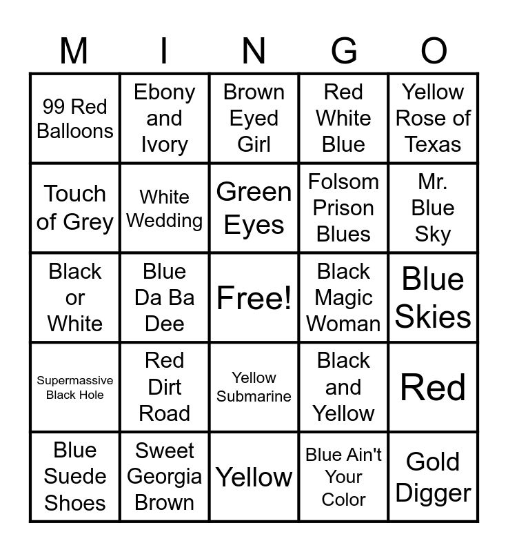 This bingo card has a free space and 31 words: Yellow, Back in Black, Blue Da Ba Dee, Purple Rain, 99 Red Balloons, Brown Eyed Girl, White Wedding, Black and Yellow, Black Magic Woman, Blue Ain't Your Color, Blue Skies, Gold Digger, Goodbye Yellow Brick Road, Purple People Eater, Mr. Blue Sky, Paint It Black, Red, Red Dirt Road, Supermassive Black Hole, Yellow Submarine, Yellow Rose of Texas, Rainbow Connection, Blue Suede Shoes, Ebony and Ivory, Folsom Prison Blues, Touch of Grey, Red White Blue, Black or White, Sweet Georgia Brown, Green Eyes and Green Onions.