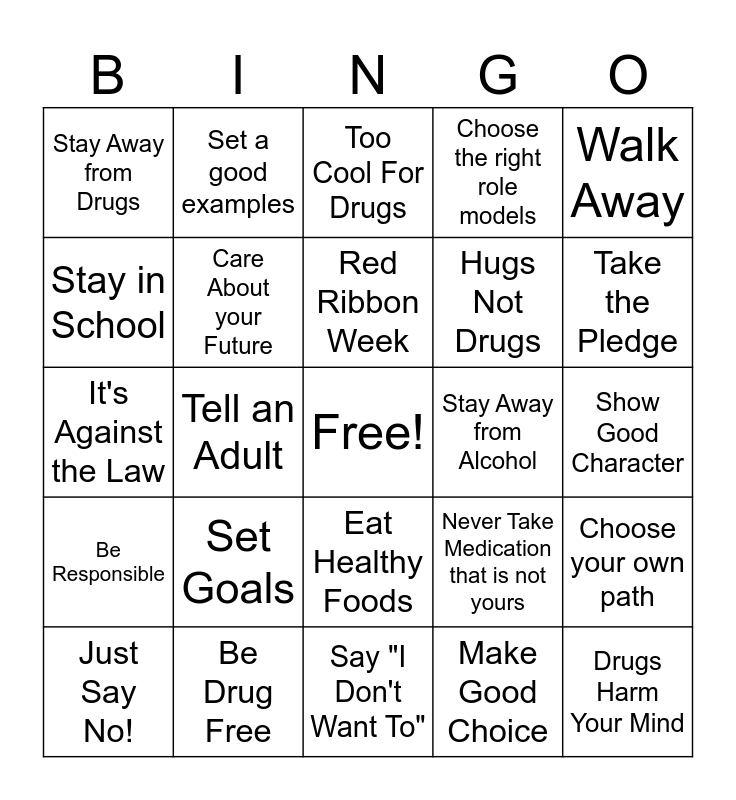 This bingo card has a free space and 29 words: Just Say No!, Go to College, Tell an Adult, Choose Friends Wisely, Stay Away from Drugs, Too Cool For Drugs, Care About your Future, Set Goals, Stay Away from Alcohol, Be Drug Free, Show Good Character, Drugs Harm Your Mind, Say "I Don't Want To", Make Good Choice, Take the Pledge, Respect Your Body, Eat Healthy Foods, Be Responsible, Walk Away, It's Against the Law, Never Take Medication that is not yours, Drugs Harm Your Body, Hugs Not Drugs, Stay in School, Choose the right role models, Set a good examples, Choose your own path, Red Ribbon Week and Be a good listener.