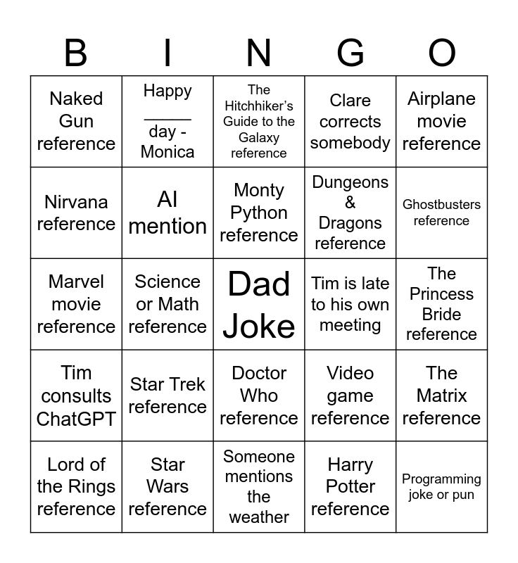 This bingo card has a free space and 24 words: Star Trek reference, Star Wars reference, Monty Python reference, Lord of the Rings reference, Airplane movie reference, Naked Gun reference, Nirvana reference, Happy _____ day - Monica, Tim is late to his own meeting, Doctor Who reference, Dungeons & Dragons reference, Marvel movie reference, Video game reference, The Matrix reference, AI mention, Harry Potter reference, The Princess Bride reference, The Hitchhiker’s Guide to the Galaxy reference, Ghostbusters reference, Science or Math reference, Programming joke or pun, Tim consults ChatGPT, Clare corrects somebody and Someone mentions the weather.