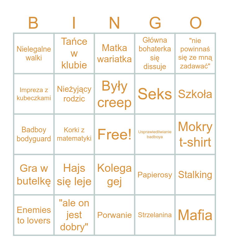 This bingo card has a free space and 29 words: Enemies to lovers, Badboy x princess, Korki z matematyki, Wchodzenie przez okno, Nielegalne walki, Matka wariatka, Nieżyjący rodzic, Hajs się leje, Usprawiedliwianie badboya, "ale on jest dobry", Mokry t-shirt, Mafia, Porwanie, Strzelanina, Szkoła, Przyjaciółka alkoholiczka, Kolega gej, Gra w butelkę, "nie powinnaś się ze mną zadawać", Badboy bodyguard, Papierosy, Tatuaże, Seks, Impreza z kubeczkami, Główna bohaterka się dissuje, Tańce w klubie, Stalking, Były creep and Shopping.