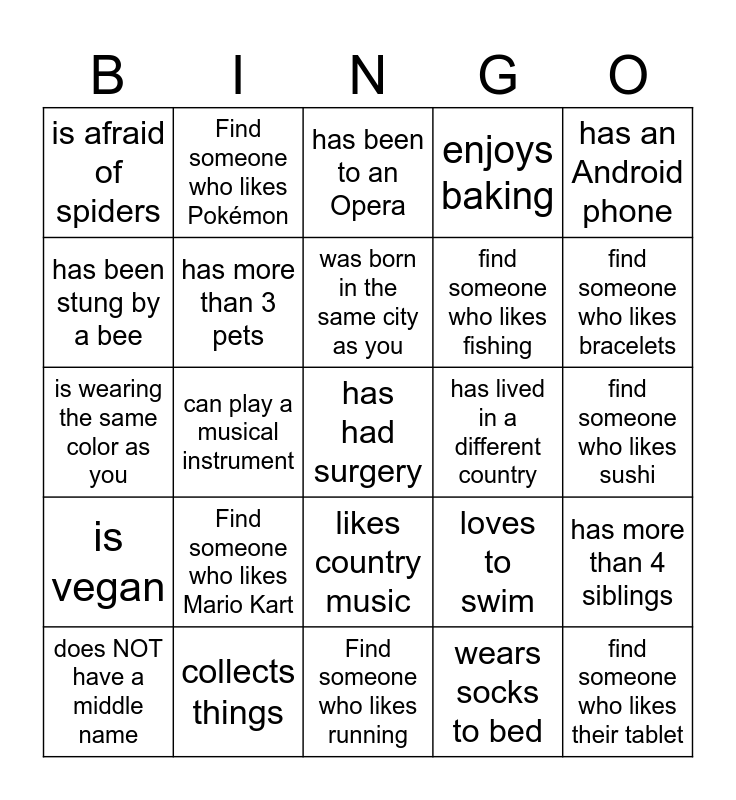 This bingo card has 35 words: hasn't had breakfast today, finished a book recently, can juggle, has more than 3 pets, likes country music, enjoys baking, has been stung by a bee, likes very spicy food, was born in the same city as you, was born in October, is wearing the same color as you, has an Android phone, Free!, is an only child, is afraid of spiders, has lived in a different country, wears socks to bed, can play a musical instrument, is vegan, has had surgery, loves to swim, does NOT have a middle name, has more than 4 siblings, collects things, has been to an Opera, find someone who likes bracelets, find someone who likes their tablet, find someone who likes roblox, find someone who likes fishing, find someone who likes sushi, Find someone who plays an instrument, Find someone who likes running, Find someone who likes Mario Kart, Find someone who likes Pokémon and Find someone who can cook.