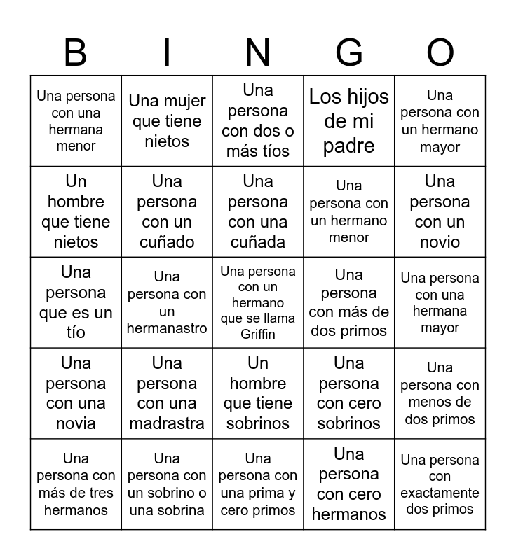 This bingo card has a free space and 29 words: Una persona con excactamente dos hermanos, Una persona con un sobrino o una sobrina, Una persona con dos o más tíos, Una persona con un abuelo, Una persona con un hermano mayor, Una persona con una hermana menor, Una persona con un cuñado, Una persona con una cuñada, Una persona con más de dos primos, Una persona con menos de dos primos, Una persona con más de tres hermanos, Una persona con un hermanastro, Una persona con cero hermanos, Una persona con exactamente dos primos, Una persona que es un tío, Una persona con un primo y cero primas, Una persona con una prima y cero primos, Una persona con cero sobrinos, Una persona con un novio, Una persona con una novia, Una persona con una madrastra, Una persona con cero primos, Una persona con un hermano menor, Una persona con una hermana mayor, Un hombre que tiene nietos, Una mujer que tiene nietos, Un hombre que tiene sobrinos, Los hijos de mi padre and Una mujer que tiene sobrinos.