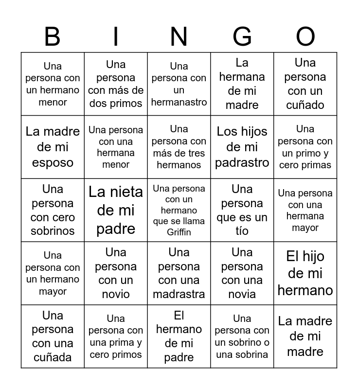 This bingo card has a free space and 34 words: Una persona con excactamente dos hermanos, Una persona con un sobrino o una sobrina, Una persona con dos o más tíos, Una persona con un abuelo, Una persona con un hermano mayor, Una persona con una hermana menor, Una persona con un cuñado, Una persona con una cuñada, Una persona con más de dos primos, Una persona con menos de dos primos, Una persona con más de tres hermanos, Una persona con un hermanastro, Una persona con cero hermanos, Una persona con exactamente dos primos, Una persona que es un tío, Una persona con un primo y cero primas, Una persona con una prima y cero primos, Una persona con cero sobrinos, Una persona con un novio, Una persona con una novia, Una persona con una madrastra, Una persona con cero primos, Una persona con un hermano menor, Una persona con una hermana mayor, El hermano de mi padre, La madre de mi madre, La hermana de mi madre, La sobrina de mi padre, Los hijos de mi padrastro, La madre de mi esposo, La hermana de mi esposa, La nieta de mi padre, El hijo de mi hermano and El hermano de mi esposo.