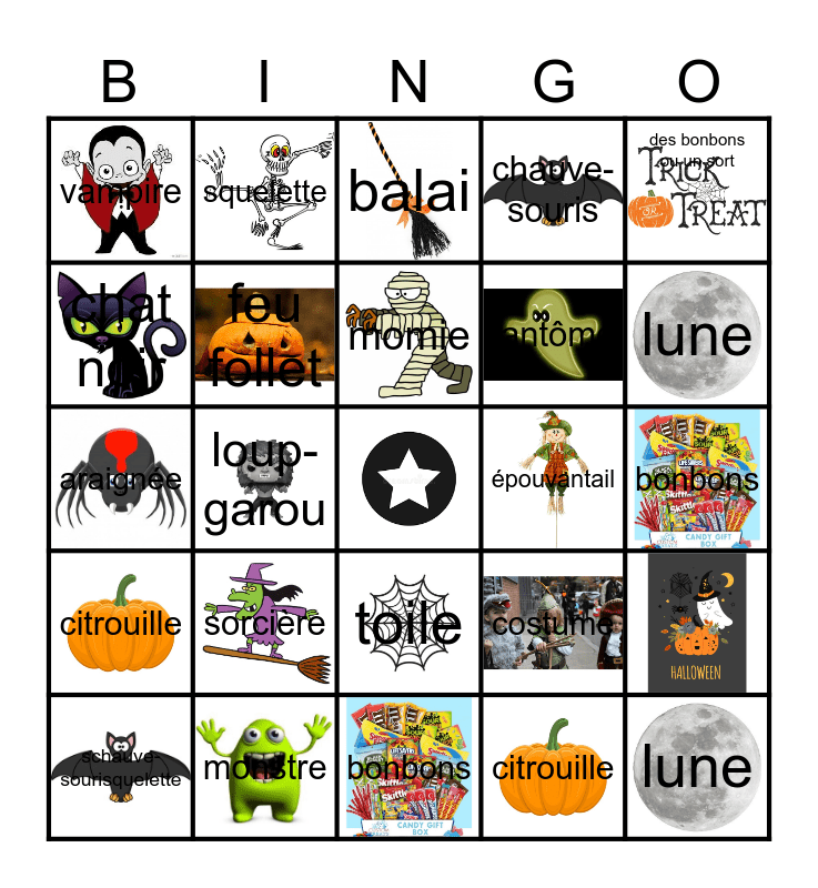 This bingo card has 24 images, a free space and 23 words: sorcière, monstre, momie, schauve-sourisquelette, des bonbons ou un sort, vampire, chat noir, squelette, épouvantail, toile, fantôme, araignée, costume, feu follet, citrouille, bonbons, balai, lune, loup-garou, lune, citrouille, chauve-souris and bonbons.