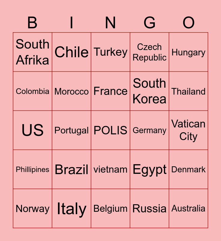This bingo card has a free space and 50 words: Argentina, Australia, Austria, Belgium, Brazil, Canada, Chile, China, Colombia, Croatia, Morocco, Czech Republic, Denmark, Egypt, England, Finland, France, Germany, Greece, Hungary, Portugal, Russia, South Afrika, South Korea, Spain, Sweden, Thailand, Luxembourgh, Turkey, vietnam, Iceland, India, Indonesia, Ireland, Italy, Jamaica, Japan, Suriname, Singapore, Vatican City, Mexico, Netherlands, New Zealand, Nigeria, Norway, US, Panama, Peru, Phillipines and Poland.