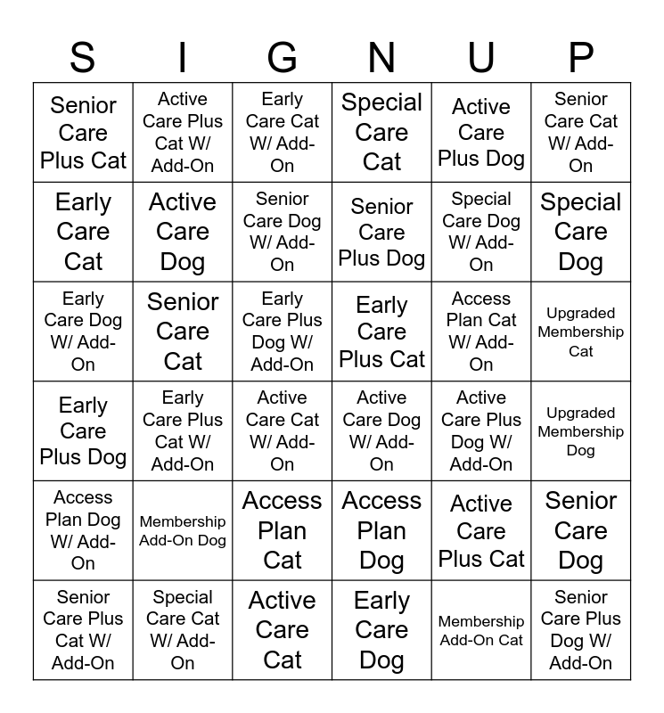 This bingo card has 36 words: Access Plan Dog, Access Plan Cat, Early Care Dog, Early Care Cat, Early Care Plus Dog, Early Care Plus Cat, Active Care Dog, Active Care Cat, Active Care Plus Dog, Active Care Plus Cat, Special Care Dog, Special Care Cat, Senior Care Dog, Senior Care Cat, Senior Care Plus Dog, Senior Care Plus Cat, Access Plan Dog W/ Add-On, Access Plan Cat W/ Add-On, Early Care Dog W/ Add-On, Early Care Cat W/ Add-On, Early Care Plus Dog W/ Add-On, Early Care Plus Cat W/ Add-On, Active Care Dog W/ Add-On, Active Care Cat W/ Add-On, Active Care Plus Dog W/ Add-On, Active Care Plus Cat W/ Add-On, Special Care Dog W/ Add-On, Special Care Cat W/ Add-On, Senior Care Dog W/ Add-On, Senior Care Cat W/ Add-On, Senior Care Plus Dog W/ Add-On, Senior Care Plus Cat W/ Add-On, Upgraded Membership Dog, Upgraded Membership Cat, Membership Add-On Dog and Membership Add-On Cat.
