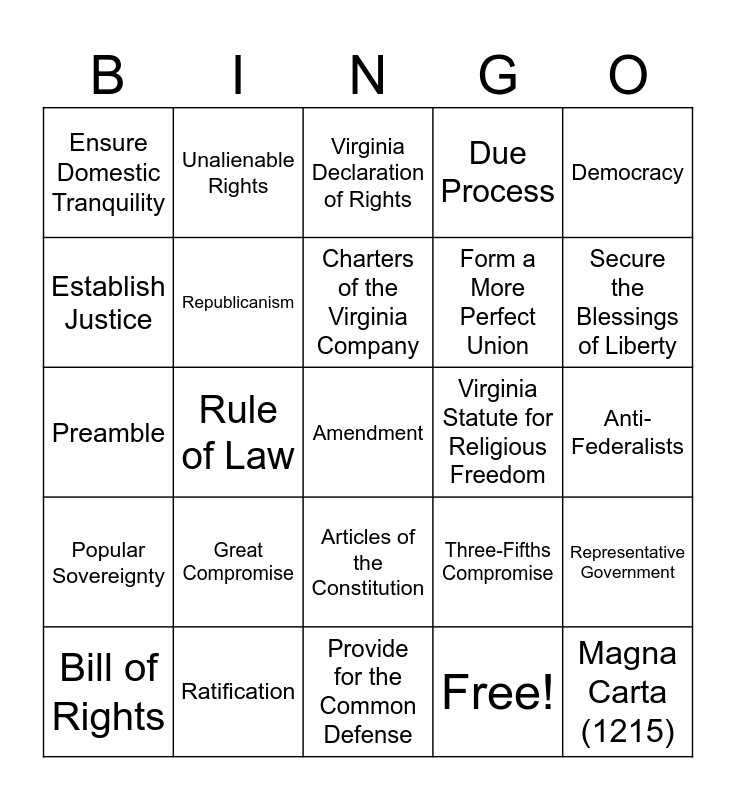 This bingo card has 32 words: Free!, BINGO WORDS (for student boards), Rule of Law, Limited Government, Popular Sovereignty, Republicanism, Democracy, Representative Government, Unalienable Rights, Magna Carta (1215), Charters of the Virginia Company, Virginia Declaration of Rights, Declaration of Independence, Articles of Confederation, Virginia Statute for Religious Freedom, U.S. Constitution, Bill of Rights, Preamble, Articles of the Constitution, Great Compromise, Three-Fifths Compromise, Federalists, Anti-Federalists, Ratification, Amendment, Due Process, Form a More Perfect Union, Establish Justice, Ensure Domestic Tranquility, Provide for the Common Defense, Promote the General Welfare and Secure the Blessings of Liberty.