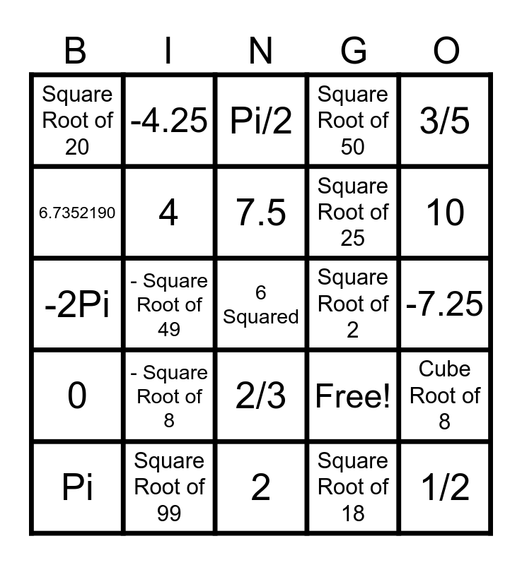 This bingo card has 25 words: - Square Root of 8, 2, 7.5, Pi, 3/5, Square Root of 20, 6.7352190, -4.25, Square Root of 2, 2/3, Square Root of 25, -2Pi, Free!, Cube Root of 8, 4, 1/2, -7.25, Pi/2, 10, - Square Root of 49, 6 Squared, Square Root of 99, 0, Square Root of 50 and Square Root of 18.