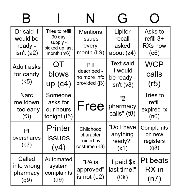 This bingo card has a free space and 24 words: Printer issues (y4), Automated system complaints (d9), Pill described - no more info provided (j3), Called into wrong pharmacy (g9), Asks to refill 3+ RXs now (e6), Dr said it would be ready - isn't (a2), Adult asks for candy (k5), Tries to refill 90 day supply - picked up last month (m6), "2 pharmacy calls" (t8), Childhood character ruined by costume (h3), Text said it would be ready - isn't (v8), Narc meltdown - too early (f3), "Do I have anything ready?" (x1), Complaints on new registers (q8), QT blows up (c4), "I paid $x last time!" (0k), Tries to refill expired rx (n0), Mentions issues every month (L9), WCP calls (r5), Someone asks for our hours tonight (t5), Pt beats RX in (n7), Pt overshares (p7), Lipitor recall asked about (z4) and "PA is approved" is not (u2).