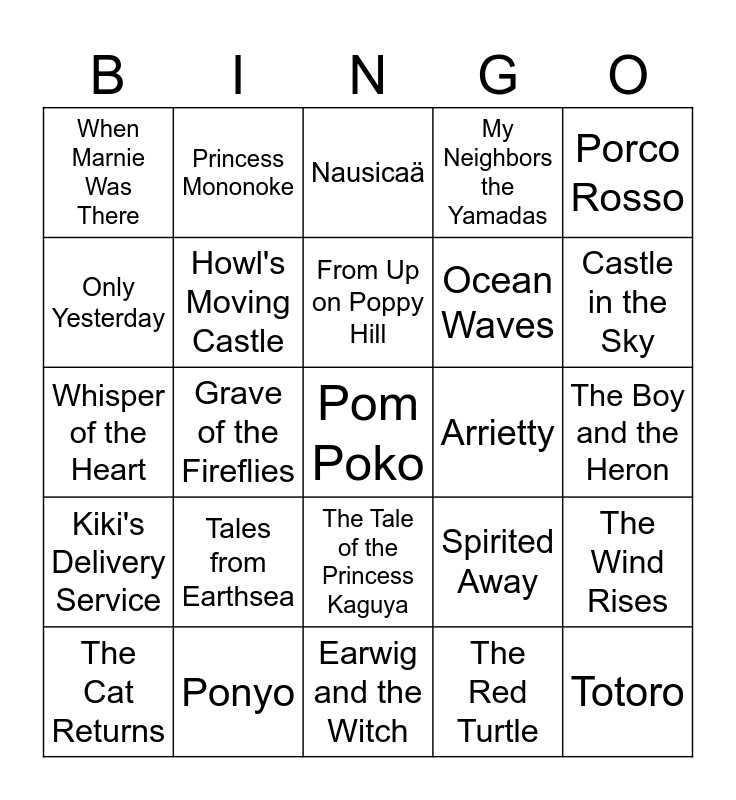 This bingo card has 25 words: Kiki's Delivery Service, Ponyo, Pom Poko, The Red Turtle, Porco Rosso, When Marnie Was There, Princess Mononoke, Nausicaä, Arrietty, The Wind Rises, Only Yesterday, Howl's Moving Castle, Earwig and the Witch, Spirited Away, Castle in the Sky, The Cat Returns, Grave of the Fireflies, From Up on Poppy Hill, Ocean Waves, The Boy and the Heron, Whisper of the Heart, Tales from Earthsea, The Tale of the Princess Kaguya, My Neighbors the Yamadas and Totoro.