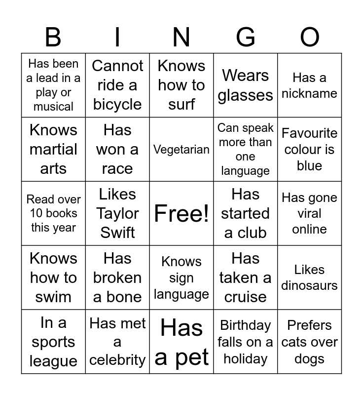 This bingo card has a free space and 24 words: Has broken a bone, Has met a celebrity, Vegetarian, In a sports league, Has a nickname, Has been a lead in a play or musical, Knows martial arts, Cannot ride a bicycle, Has started a club, Knows sign language, Can speak more than one language, Read over 10 books this year, Has taken a cruise, Likes dinosaurs, Has won a race, Birthday falls on a holiday, Has gone viral online, Knows how to surf, Favourite colour is blue, Likes Taylor Swift, Prefers cats over dogs, Knows how to swim, Wears glasses and Has a pet.