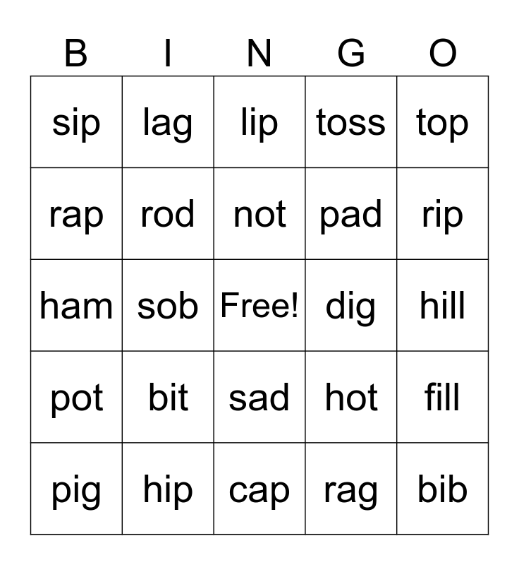 This bingo card has a free space and 36 words: mop, jog, pop, rod, hot, pot, not, cot, top, cob, sob, toss, hid, dig, rip, sip, pin, bit, bib, lip, hill, fill, hip, pig, cap, lag, ham, sap, pad, rap, jam, at, rag, sad, hat and fan.