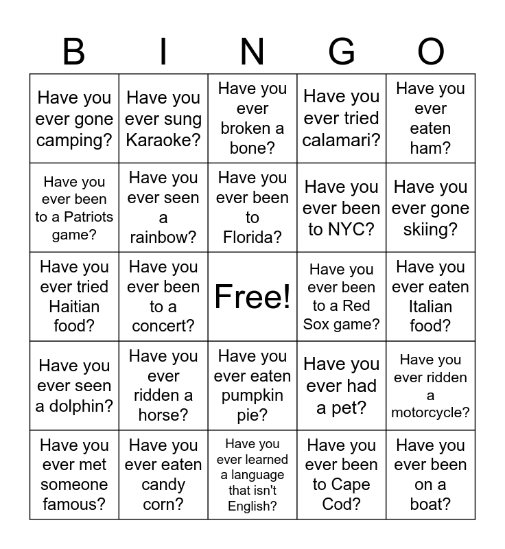 This bingo card has a free space and 24 words: Have you ever ridden a horse?, Have you ever eaten candy corn?, Have you ever been to Florida?, Have you ever met someone famous?, Have you ever eaten ham?, Have you ever gone camping?, Have you ever been to a Patriots game?, Have you ever sung Karaoke?, Have you ever been to a Red Sox game?, Have you ever eaten pumpkin pie?, Have you ever been to NYC?, Have you ever tried Haitian food?, Have you ever had a pet?, Have you ever ridden a motorcycle?, Have you ever seen a rainbow?, Have you ever been to Cape Cod?, Have you ever eaten Italian food?, Have you ever broken a bone?, Have you ever gone skiing?, Have you ever been to a concert?, Have you ever been on a boat?, Have you ever seen a dolphin?, Have you ever tried calamari? and Have you ever learned a language that isn't English?.