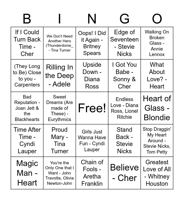 This bingo card has a free space and 49 words: I Wanna Dance with Somebody (Wo loves me) - Whitney Houston, Greatest Love of All - Whitney Houston, Respect - Aretha Franklin, Chain of Fools - Aretha Franklin, Proud Mary - Tina Turner, What's Love Got to Do With It - Tina Turner, We Don't Need Another Hero (Thunderdome_ - Tina Turner, Rainy Days And Mondays - Carpenters, (They Long to Be) Close to you - Carpenters, Rumour Has It - Adele, Rilling In the Deep - Adele, Edge of Seventeen - Stevie Nicks, Stop Draggin' My Heart Around - Stevie Nicks, Tom Petty, Stand Back - Stevie Nicks, Hot Stuff - Donna Summer, She Works Hard for the Money - Donna Summer, Upside Down - Diana Ross, Endless Love - Diana Ross, Lionel Ritchie, Emotions - Mariah Carey, Walking On Broken Glass - Annie Lennox, Sweet Dreams (Are made of These) - Eurythmics, Believe - Cher, If I Could Turn Back Time - Cher, I Got You Babe - Sonny & Cher, Alone - Heart, What About Love? - Heart, Magic Man - Heart, Rehab - Amy Winehouse, Girls Just Wanna Have Fun - Cyndi Lauper, Time After Time - Cyndi Lauper, Raise Your Glass - P!nk, Get the Party Started - P!nk, Since You Been Gone - Kelly Clarkson, Physical - Olivia Newton-John, You're the Only One that I Want - John Travolta, Olivia Newton-John, Hit Me With Your Best Shot - Pat Benatar, I Feel for You - Chaka Kahn, Call Me - Blondie, Heart of Glass - Blondie, Nasty - Janet Jackson, You're So Vain - Carly Simon, Walk Like an Egyptian - The Bangles, No Scrubs - TLC, Push It - Salt-N-Pepa, Bad Reputation - Joan Jett & the Blackhearts, Oops! I Did it Again - Britney Spears, Vacation - The Go-Go's, We Got the Beat - The Go-Go's and Forever Your Girl - Paula Abdul.