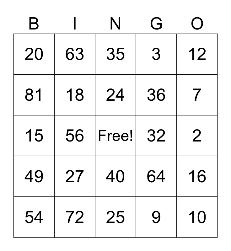 This bingo card has a free space and 29 words: 54, 12, 56, 21, 20, 35, 18, 27, 32, 72, 2, 10, 25, 9, 7, 14, 40, 49, 12, 15, 64, 8, 36, 81, 3, 63, 16, 24 and 28.
