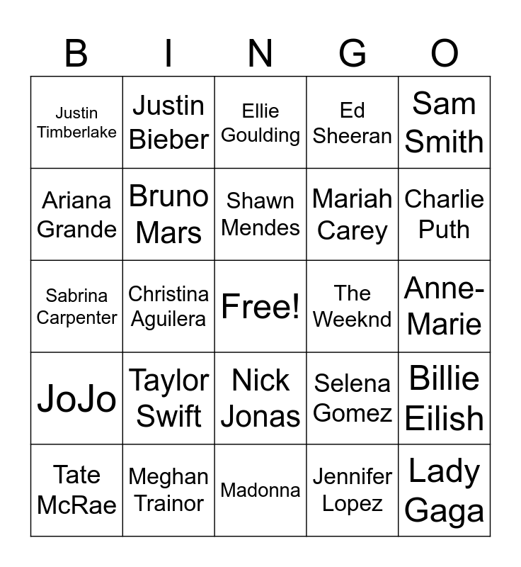 This bingo card has a free space and 50 words: Michael Jackson, Lady Gaga, Britney Spears, Madonna, Taylor Swift, Beyoncé, Justin Bieber, Katy Perry, Ariana Grande, Rihanna, Bruno Mars, Ed Sheeran, Billie Eilish, Selena Gomez, Harry Styles, Dua Lipa, Shawn Mendes, The Weeknd, Olivia Rodrigo, Sam Smith, Christina Aguilera, Jennifer Lopez, Justin Timberlake, Mariah Carey, Demi Lovato, Camila Cabello, Charlie Puth, Halsey, Ellie Goulding, Nick Jonas, Sia, Troye Sivan, Ava Max, Zara Larsson, Meghan Trainor, Carly Rae Jepsen, Tove Lo, Normani, Bebe Rexha, Anne-Marie, Jason Derulo, Niall Horan, Becky G, Conan Gray, Tate McRae, Sabrina Carpenter, Alec Benjamin, Noah Cyrus, JoJo and Jessie J.