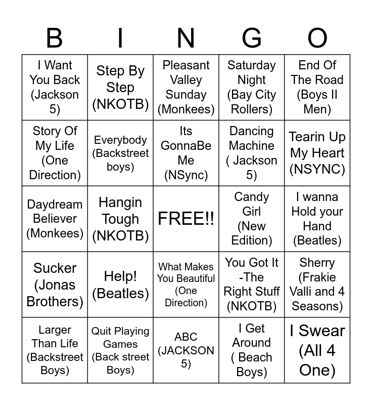 This bingo card has a free space and 33 words: BYE BYE BYE (NSYNC), MMMBOP (Hanson), Hangin Tough (NKOTB), Last train To Clarksville (Monkees), Sucker (Jonas Brothers), Everybody (Backstreet boys), End Of The Road (Boys II Men), Larger Than Life (Backstreet Boys), Step By Step (NKOTB), Motown Philly (Boys II Men), Its GonnaBe Me (NSync), Pleasant Valley Sunday (Monkees), Let It Be (Beatles), I want it That Way (Backstreet Boys), Candy Girl (New Edition), Tearin Up My Heart (NSYNC), Quit Playing Games (Back street Boys), Daydream Believer (Monkees), Help! (Beatles), You Got It -The Right Stuff (NKOTB), What Makes You Beautiful (One Direction), Ob-La-Di Ob-La-Da (Beatles), I Want You Back (Jackson 5), I wanna Hold your Hand (Beatles), ABC (JACKSON 5), I Swear (All 4 One), Saturday Night (Bay City Rollers), Dancing Machine ( Jackson 5), Story Of My Life (One Direction), Sherry (Frakie Valli and 4 Seasons), I cant take My Eyes off of You (Frankie Valli and 4 seasons), I Get Around ( Beach Boys) and California Girls (Beach Boys).