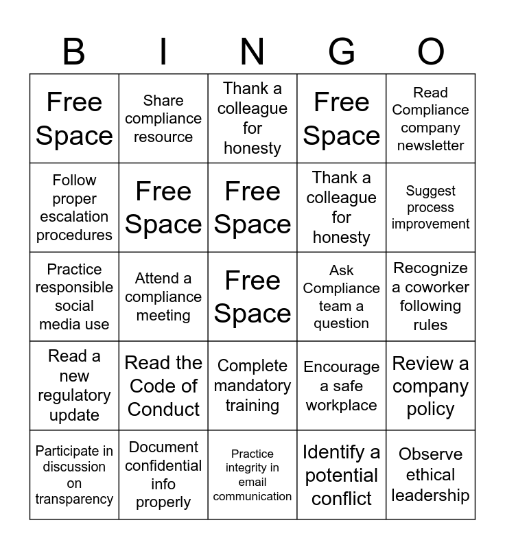 This bingo card has a free space and 24 words: Read the Code of Conduct, Document confidential info properly, Free Space, Participate in discussion on transparency, Read Compliance company newsletter, Free Space, Follow proper escalation procedures, Share compliance resource, Ask Compliance team a question, Complete mandatory training, Thank a colleague for honesty, Practice responsible social media use, Encourage a safe workplace, Review a company policy, Free Space, Identify a potential conflict, Recognize a coworker following rules, Thank a colleague for honesty, Suggest process improvement, Attend a compliance meeting, Observe ethical leadership, Read a new regulatory update, Free Space and Practice integrity in email communication.