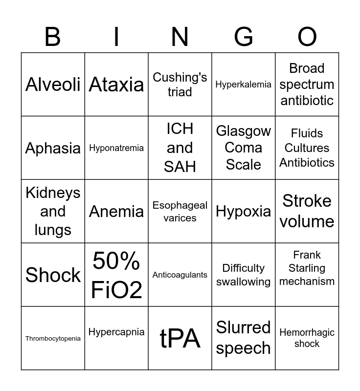 This bingo card has a free space and 24 words: 50% FiO2, Hypercapnia, ICH and SAH, Thrombocytopenia, Broad spectrum antibiotic, Alveoli, Aphasia, Ataxia, Hypoxia, Anticoagulants, Glasgow Coma Scale, Kidneys and lungs, Difficulty swallowing, Frank Starling mechanism, Hyponatremia, Slurred speech, Stroke volume, Cushing's triad, Fluids Cultures Antibiotics, Anemia, Hemorrhagic shock, Shock, Hyperkalemia and tPA.