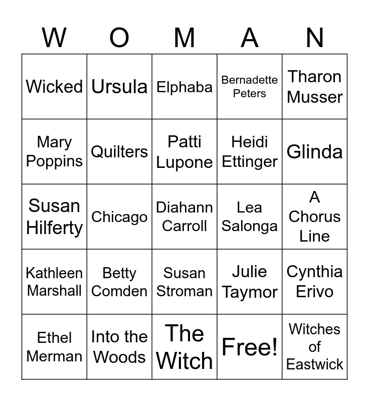 This bingo card has 30 words: Into the Woods, Waitress, Chicago, Anything Goes, Wicked, Elphaba, Quilters, Susan Stroman, Lea Salonga, The Witch, A Chorus Line, Diahann Carroll, Free!, Witches of Eastwick, Glinda, Agnes de Mille, Julie Taymor, Kathleen Marshall, Betty Comden, Tharon Musser, Susan Hilferty, 2016, Ursula, Heidi Ettinger, Mary Poppins, Bernadette Peters, Cynthia Erivo, Ethel Merman, Patti Lupone and Megan Hilty.