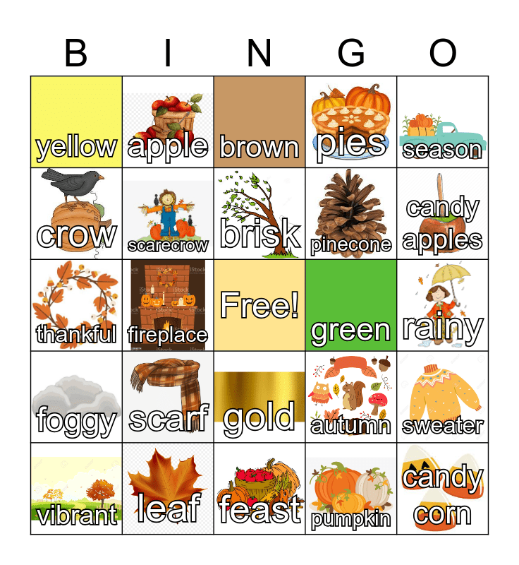 This bingo card has 46 images, a free space and 50 words: fall, leaf, october, pumpkin, sweater, harvest, apple, acorn, pinecone, coat, crow, scarecrow, autumn, candy corn, cornucopia, woods, brown, green, orange, yellow, scarf, feast, pies, candy apples, owl, bonfire, brisk, festival, season, foggy, breezy, chilly, tree, jacket, boots, spice, spooky, cranberry, family, thankful, cozy, falling, earthy, nature, vibrant, fireplace, gold, flannel, rainy and wilting.