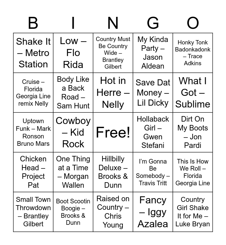 This bingo card has a free space and 50 words: Save a Horse Ride a Cowboy – Big & Rich, Country Girl Shake It for Me – Luke Bryan, Beer Never Broke My Heart – Luke Combs, Raised on Country – Chris Young, One Thing at a Time – Morgan Wallen, Where the Party At – Jagged Edge, Low – Flo Rida, Country Grammar – Nelly, Cruise – Florida Georgia Line remix Nelly, Chicken Fried – Zac Brown Band, Body Like a Back Road – Sam Hunt, My Kinda Party – Jason Aldean, This Is How We Roll – Florida Georgia Line, I’m Gonna Be Somebody – Travis Tritt, Party Up – DMX, Work It – Missy Elliott, Hot in Herre – Nelly, Hollaback Girl – Gwen Stefani, Dirt Road Anthem – Jason Aldean, Honky Tonk Badonkadonk – Trace Adkins, Cowboy – Kid Rock, Fancy – Iggy Azalea, Shake It – Metro Station, Save Dat Money – Lil Dicky, My Truck – Breland, Old Town Road – Lil Nas X, What I Got – Sublime, Big Green Tractor – Jason Aldean, Country Must Be Country Wide – Brantley Gilbert, Hillbilly Deluxe – Brooks & Dunn, Blurred Lines – Robin Thicke, Gin and Juice – Snoop Dogg, All About That Bass – Meghan Trainor, Watermelon Moonshine – Lainey Wilson, Boot Scootin Boogie – Brooks & Dunn, Pour Some Sugar on Me – Def Leppard, Country Girl Shake – Lee Brice, Jump On It – Sir Mix A Lot, Life Is a Highway – Rascal Flatts, Dirt On My Boots – Jon Pardi, White Iverson – Post Malone, Yeah – Usher, The Git Up – Blanco Brown, Man I Feel Like a Woman – Shania Twain, Small Town Throwdown – Brantley Gilbert, Uptown Funk – Mark Ronson Bruno Mars, Country Ain’t Country – Clay Walker, Hypnotize – Notorious BIG, Chicken Head – Project Pat and Honky Tonk Woman – Rolling Stones.