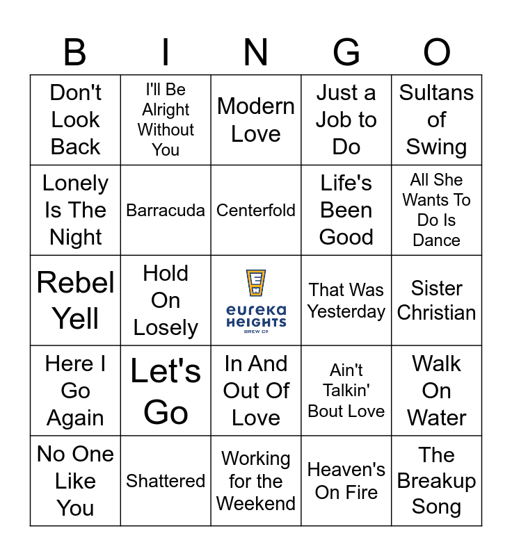 This bingo card has a free space and 24 words: Let's Go, Shattered, Centerfold, No One Like You, Sultans of Swing, Don't Look Back, Lonely Is The Night, I'll Be Alright Without You, That Was Yesterday, In And Out Of Love, Life's Been Good, Rebel Yell, Ain't Talkin' Bout Love, Walk On Water, Barracuda, Heaven's On Fire, Sister Christian, Modern Love, All She Wants To Do Is Dance, Hold On Losely, The Breakup Song, Here I Go Again, Just a Job to Do and Working for the Weekend.